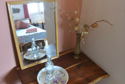 Rosa is a comfortable space with a breathtaking view from your window that spans from mountain to Ocean. It is ideal for a couple, or two single retreat guests who appreciate personal comfort: ensuite bathroom, clothes-hanging space and a writing table.